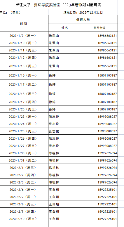 长江大学 yL23411永利官网登录实验室 2023年寒假期间值班表