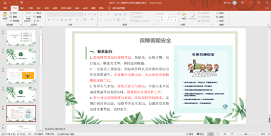 在本次会议中,李春花老师分别从五一假期安排、保障假期安全、加强信息管理和拥有健康心理四个方面为同学们详细介绍了五一假期出行需要注意的事项:合理安排好出行的计划;做好信息管理和保持健康的心理;增强自身的安全意识;预防好诈骗和可能遇到的各种危险。会议强调同学们要以自身生命安全为第一要义,与此同时在假期间要保护好自身财产安全。