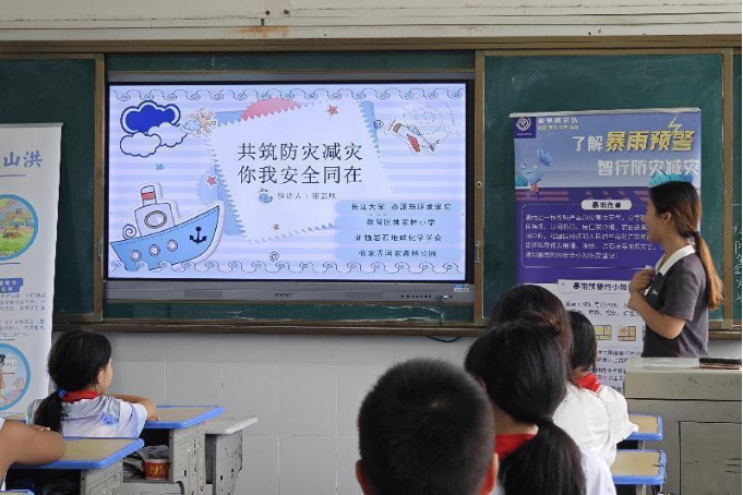 实践队成员们受到了姚家林小学师生的热烈欢迎,蒲嘉欣同学以生动有趣的语言,为小学生们深入浅出地讲解了地质灾害的基本知识,包括地质、气象灾害的成因、类型、危害及预防措施等。她通过鲜活的案例,让复杂的防灾知识变得通俗易懂,同学们在轻松愉快的氛围中掌握了防灾减灾的关键要点。