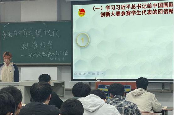 会议伊始,各班团支书带领同学们深入学习了习近平总书记给中国国际大学生创新大赛参赛学生代表的回信精神。团支书强调,创新是人类进步的源泉,而青年作为创新的重要生力军,肩负着重大使命。广大青年应弘扬科学精神,积极投身科技创新,努力促进中外科技交流、推动科技进步,在中国式现代化的广阔天地中更好地展现自身才华。同学们深刻认识到,在这个科技日新月异的时代,作为新时代的青年学子,无论是本科生还是研究生,都应积极响应号召,将创新思维融入到学习与科研中,为国家的科技发展贡献自己的智慧与力量。