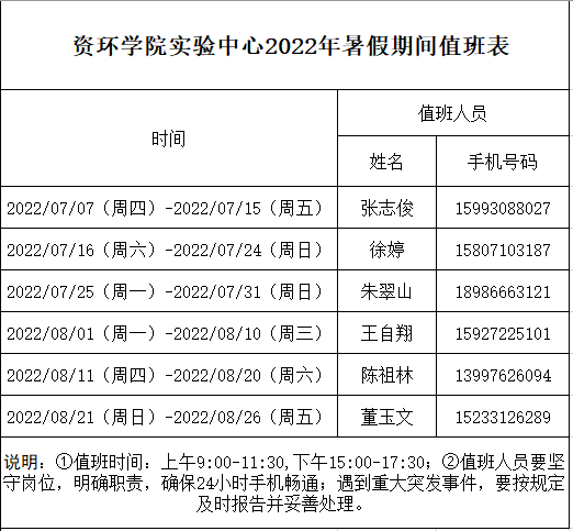 根据学院实验中心统一安排,为服务广大师生,暑假期间实验室大型仪器设备共享平台正常运转,有需检测服务的师生请登陆yL23411永利官网登录网站大型仪器设备共享平台进行预约。2022年yL23411永利官网登录实验中心暑假值班表安排如下,如遇问题请与相关值班人员联系。