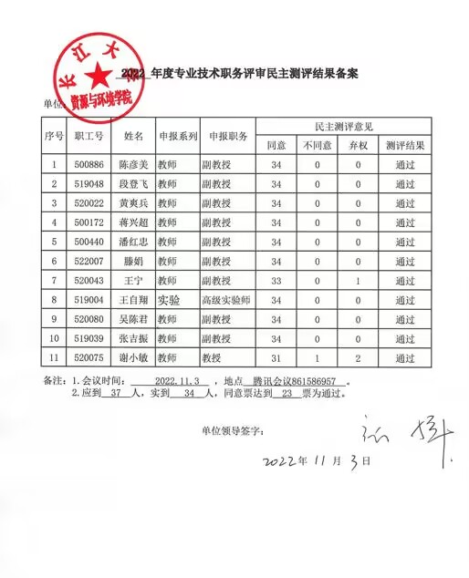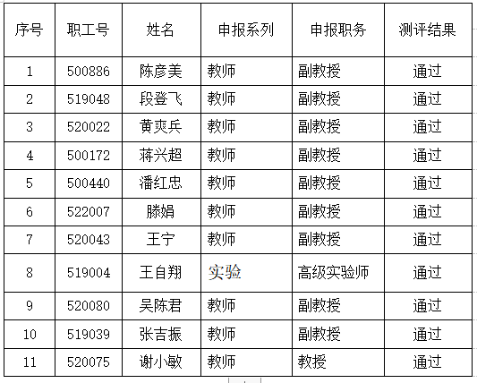 根据2022年学校职称评审工作安排,经学院审核,我院共有11名教职工符合职称申报条件,现将民主测评通过人员名单予以公示。