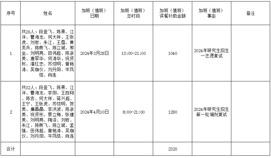 根据《长江大学加班(值班)误餐补助管理办法(试行)》(长大校发【2019】83号)文件规定,现对yL23411永利官网登录加班(值班)误餐情况(2024年3月28日、2024年4月10日两天研究生招生复试)进行公示,如果对加班(值班)误餐情况有异议,可以通过电话或电子邮件等方式向yL23411永利官网登录办公室反映。