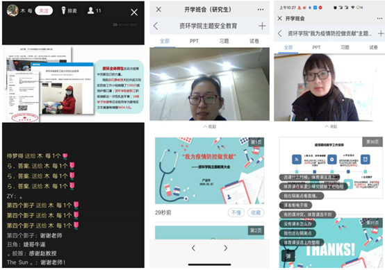 (通讯员 李婉婷 图/文)近日,新型冠状病毒感染的肺炎疫情引起了全国上下的高度重视,为了让资环学子进一步了解新型冠状病毒的相关知识并做好相应疫情的防护工作。近期我院于“雨课堂”、“QQ群”等方式召开了“我为疫情防控做贡献”的线上主题班会。本次班会分别由yL23411永利官网登录党委副书记范梅英对本科大四,yL23411永利官网登录团委书记严丽萍对研究生,辅导员李春花老师对本科大一至大三,主持开展。通过网络主题教育,将资环学子们紧紧相连,为打赢疫情防控阻击战贡献一份力量。