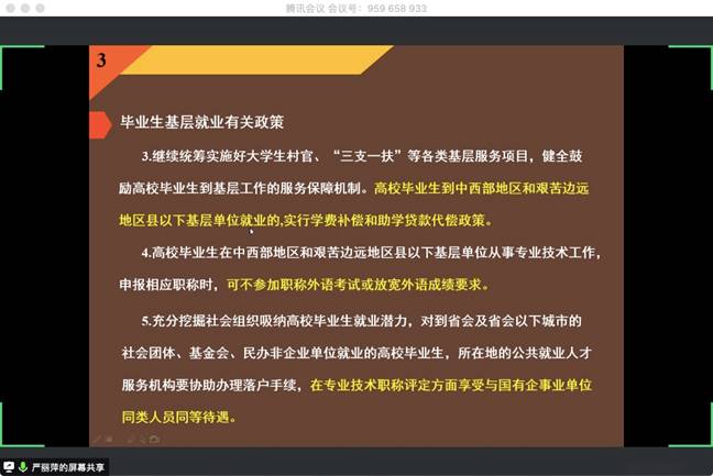 (通讯员 刘于民 图/文)在新冠疫情初步得到控制的四月,yL23411永利官网登录毕业生陆陆续续投入工作岗位,大三年级学生对就业细节一知半解,为使他们了解国家形式、就业政策等,yL23411永利官网登录严丽萍老师于4月28日通过腾讯会议开展了一次线上就业指导大会。