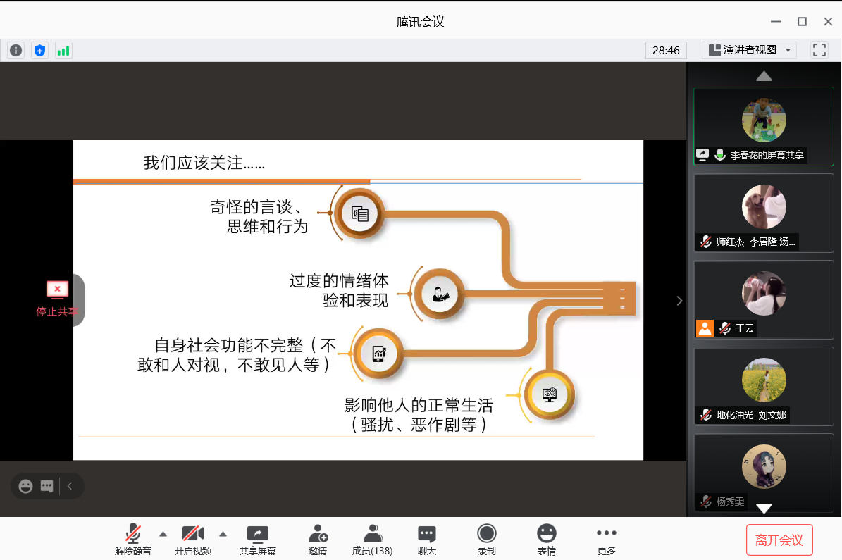 (通讯员 王云 图/文)2020年上半年,突如其来的新冠肺炎疫情打乱了我们的生活,疫情期间隔离在家,尤其是武汉人民、武汉大学生,随之而来的就是大学生疫情期间产生的严重的心理问题,随之产生了“高关怀学生”群体。针对我院学生可能出现的各类心理问题,2020年9月26日下午18:00,yL23411永利官网登录心理专干李春花老师对我院心理骨干130余人进行了线上培训。