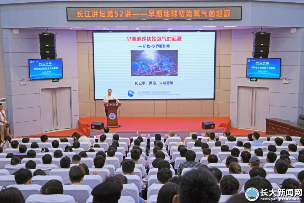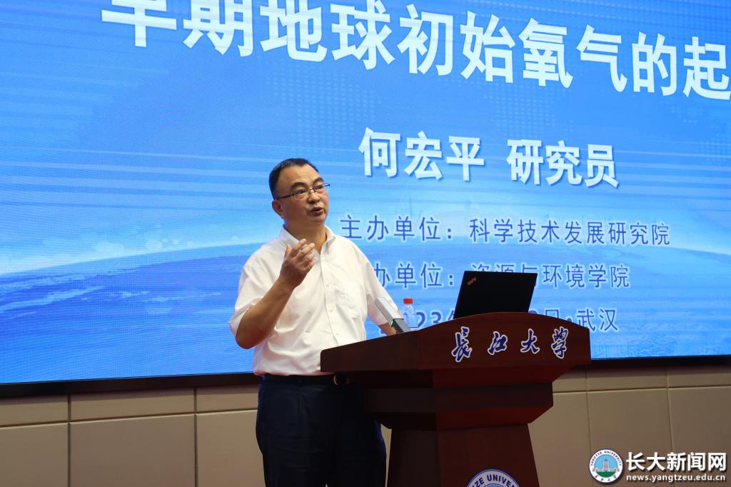 何宏平从“初始氧气由‘矿物——水界面’反应产生”的观点讲起。结合展现太古时代氧气通过光合作用产生的场景,他阐述了大氧化事件对地球演变产生的影响。“氧气对推动生物的演化起到关键作用。”何宏平强调。