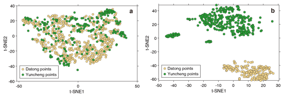 图3. 不同盆地数据的 t-SNE 低维特征。a 和 b 中的预测因子分别对应水化学参数和地表参数